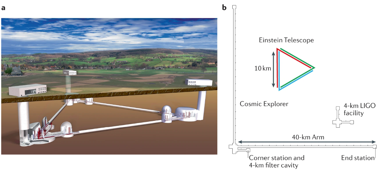 a | Concept for the Einstein Telescope. A triangular underground installation with 10-km-long arms is planned. The influence of Newtonian noise is reduced with the underground location, and the multiple detectors in the triangular arrangement give a wide sensing bandwidth and polarization resolution. b | A comparison of the Einstein Telescope and Cosmic Explorer detector configurations. For comparison, the current Advanced LIGO detector is also shown. Panel a courtesy of the ET design study team. (Source: Nature)