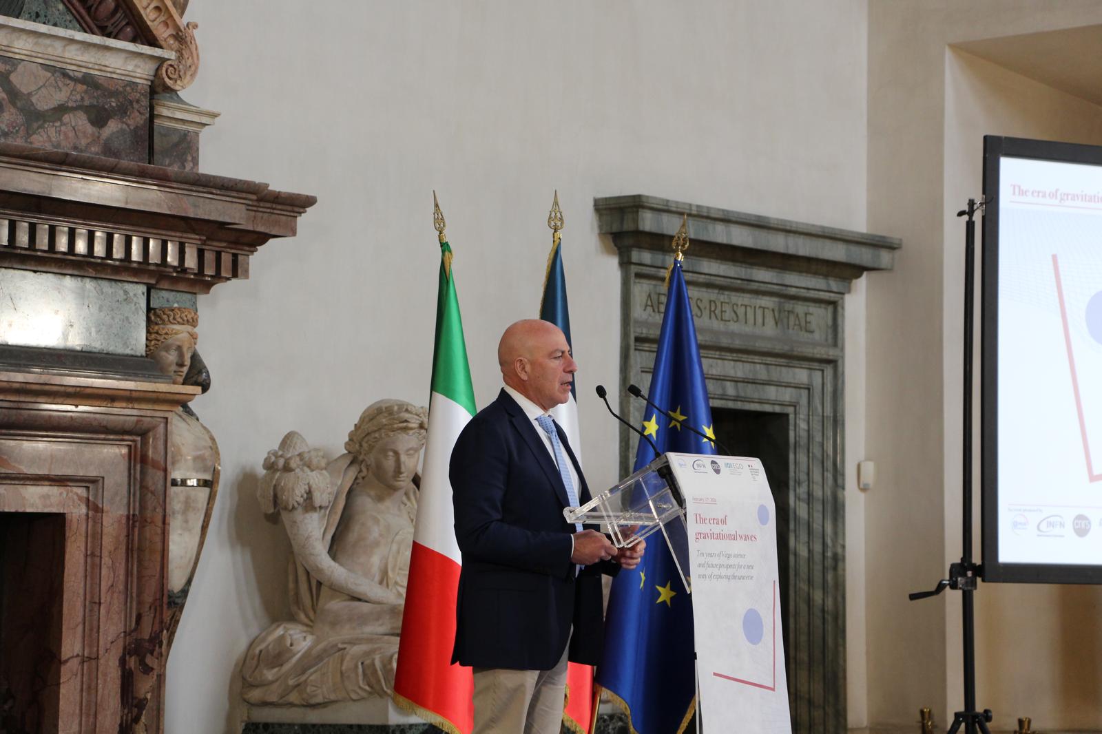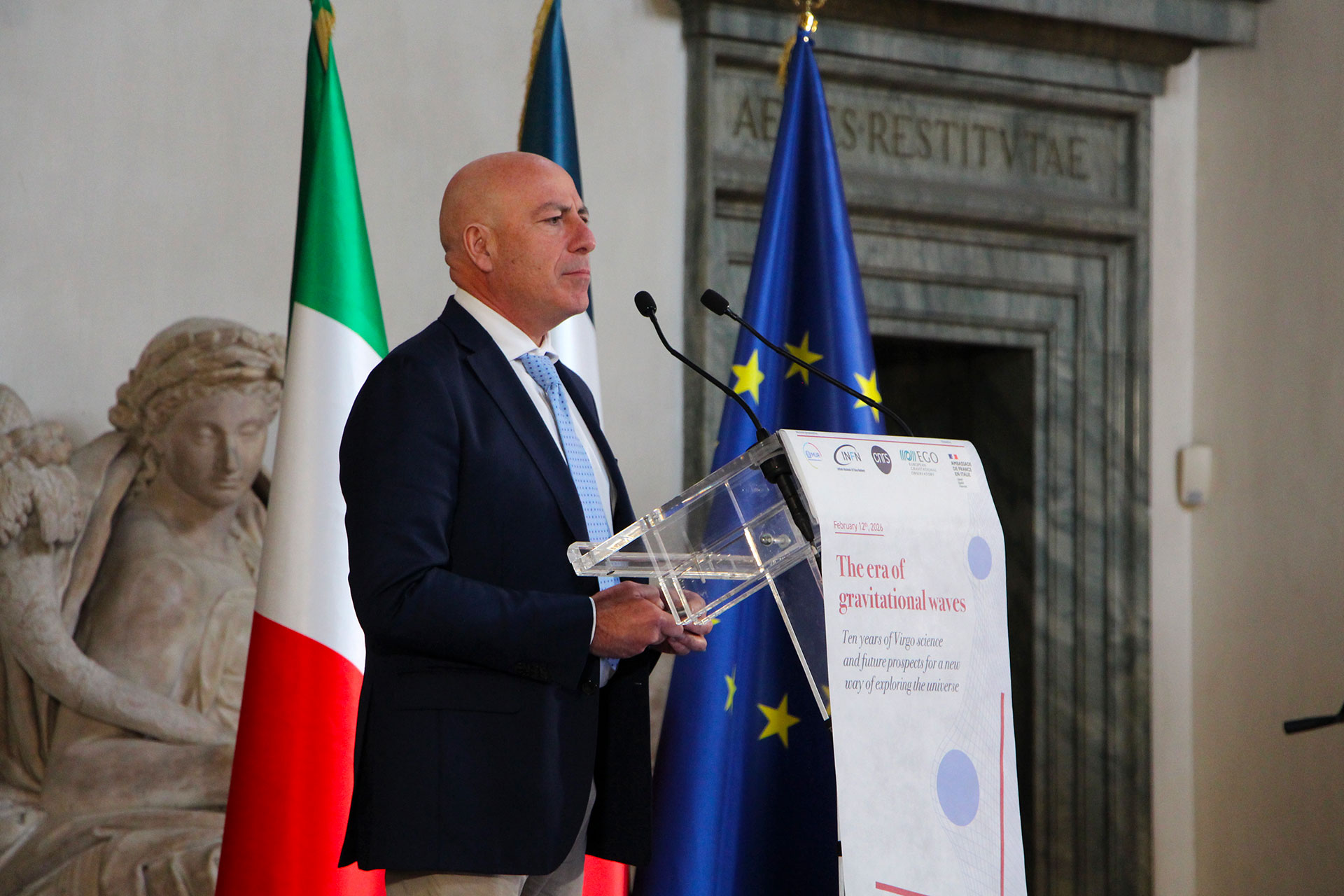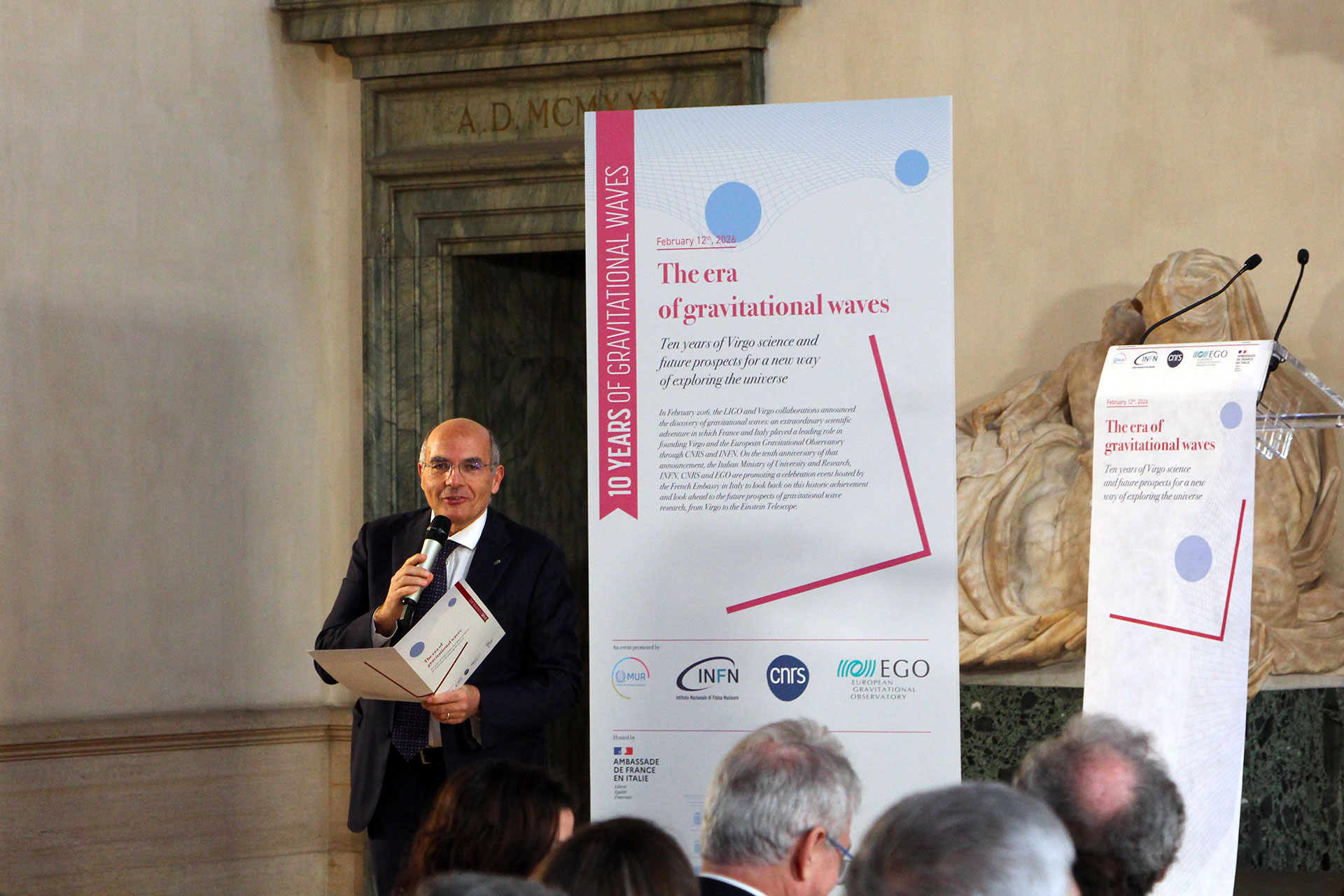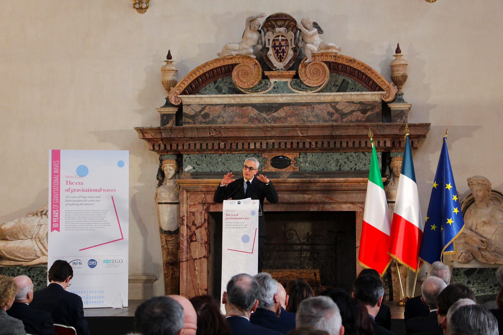 Today, 12 February 2026, the MUR Ministry of University and Research, INFN, CNRS and EGO promoted the event, hosted by the French Embassy in Rome, The era of gravitational waves. Ten years of Virgo science and future prospects for a new way of exploring the universe, to celebrate the tenth anniversary of the first historic observation of gravitational waves, retrace the discoveries that have resulted from this new way of studying the universe, and look to the future of research in the field with the upgrading of current detection instruments and the design of new ones, such as the future third-generation Einstein Telescope interferometer.