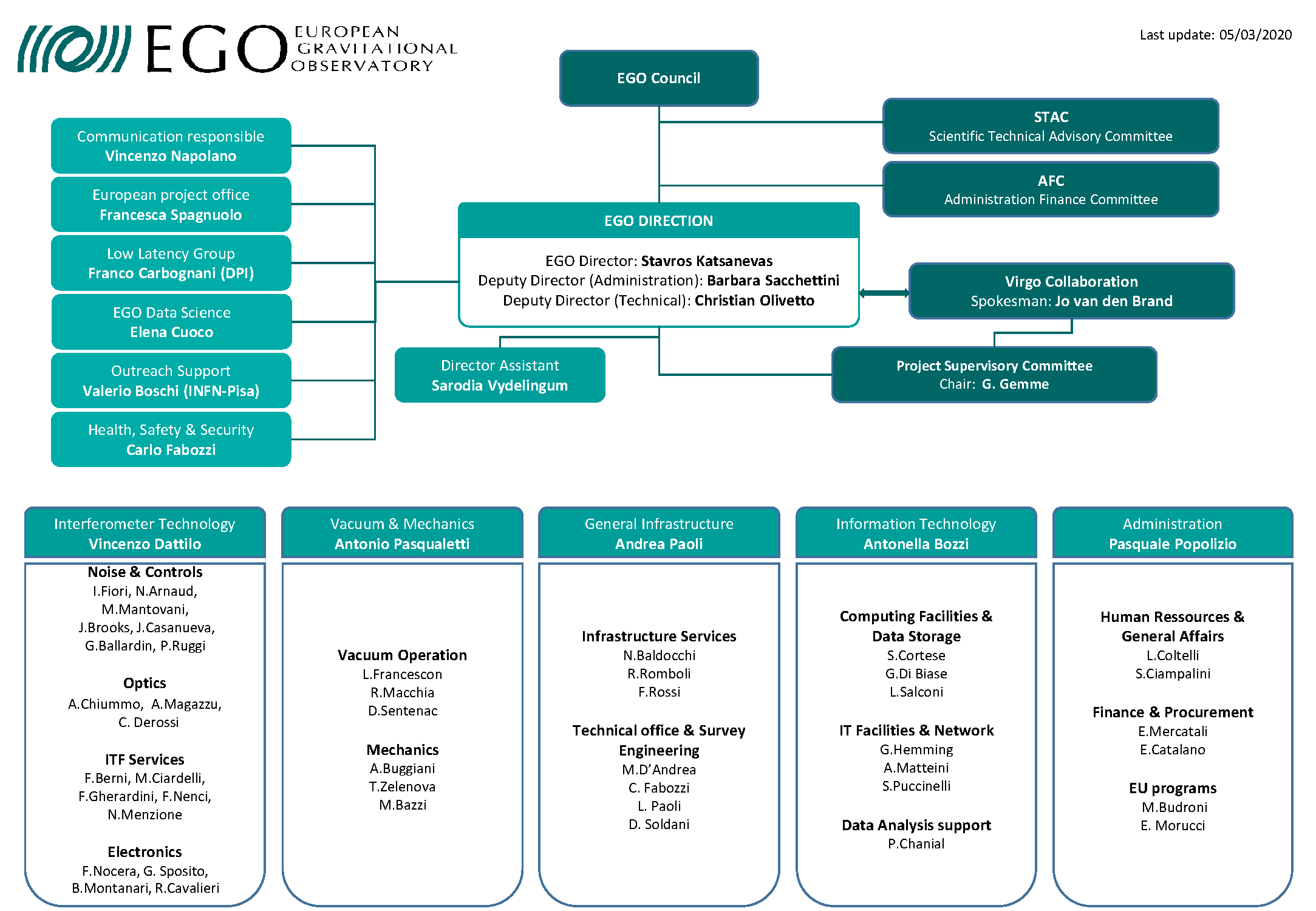 For Technological and Administration responsibilities EGO’s Director is assisted by the Technical Deputy Director, the Administrative Deputy Director and by five Heads Department, who respectively manage: